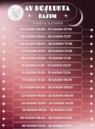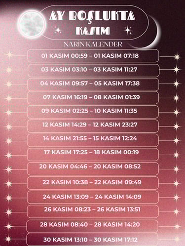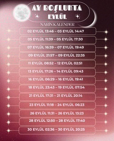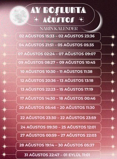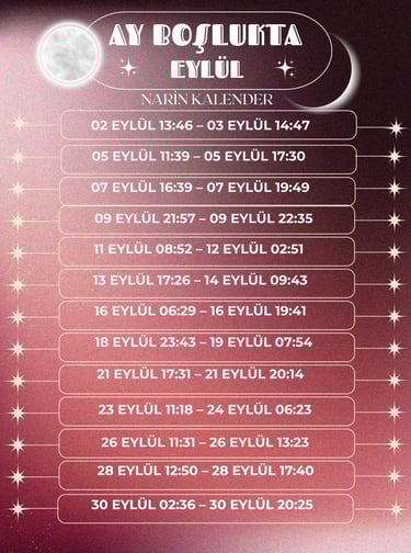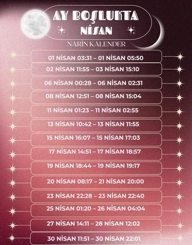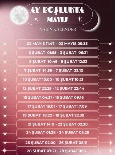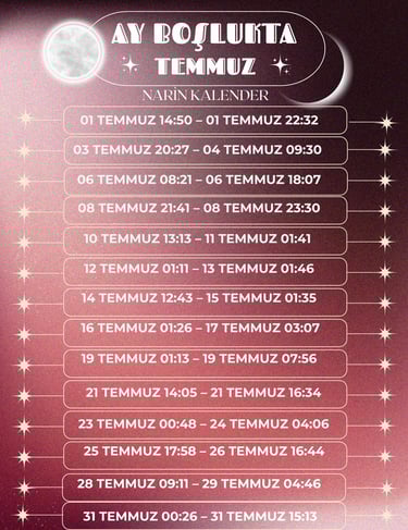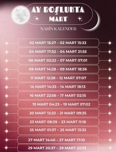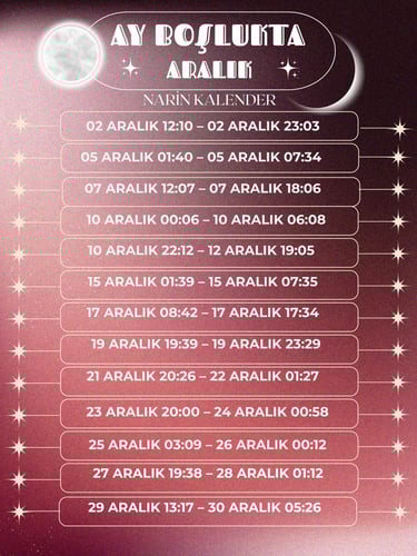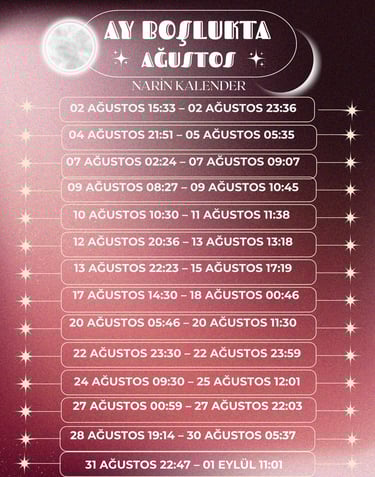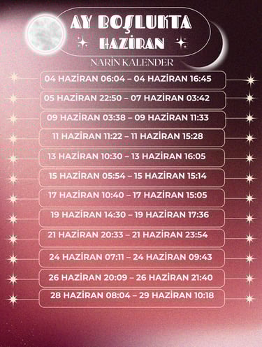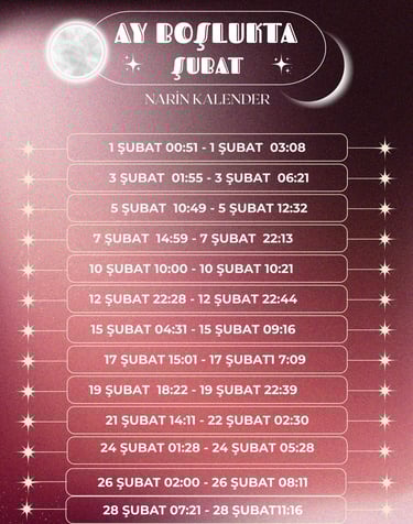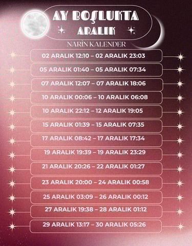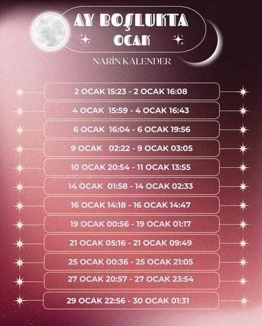 Ay zodyaktaki turunu 28,5 günde tamamlar ve her burçta ortalama 2,5 gün kalır. Ay’ın zodyak turunda ilerlerken, bir burçtan başka bir burca geçtiğinde diğer gezegenlerle çeşitli açılar kurar. Fakat bazı zaman dilimlerinde hiçbir gezegenle açı yapmaz ve kısa süre boşlukta kalır. Genellikle 2-3 günde bir birkaç saatlik zaman zarfında Ay “boşlukta” olur. İşte o birkaç saat çok önemlidir ve hayatımızı doğrudan etkiler.
